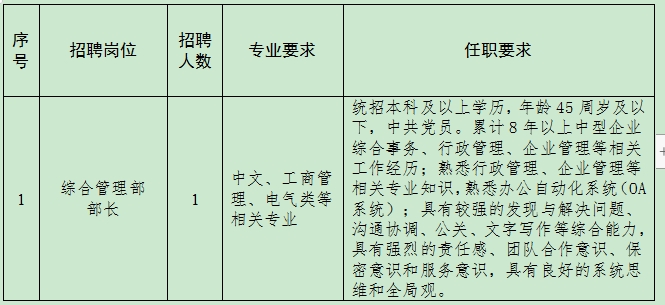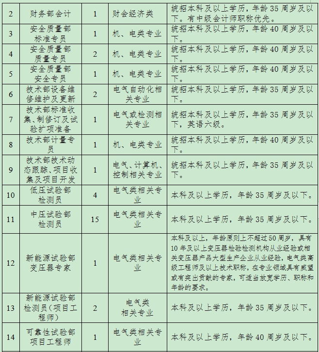 根據(jù)公司經(jīng)營發(fā)展需要,現(xiàn)面向社會招聘行政管理、財務、安全質量、變壓器專家、市場管理、檢測專業(yè)人才,有關事項公告如下: